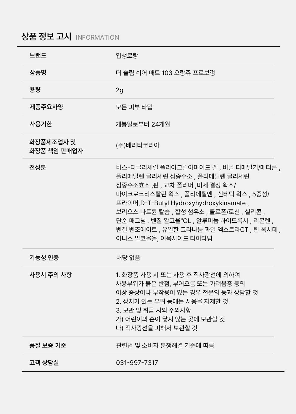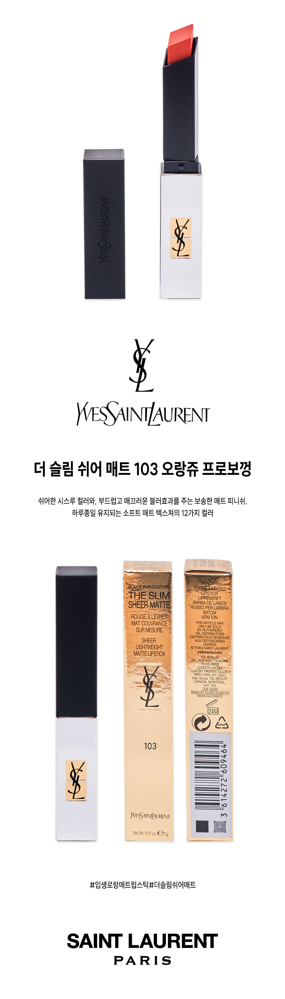 | 상품명 / 모델명 | 입생로랑 더 슬림 쉬어 매트 103 오랑쥬 프로보껑 / 입생로랑 더 슬림 쉬어 매트 103 |