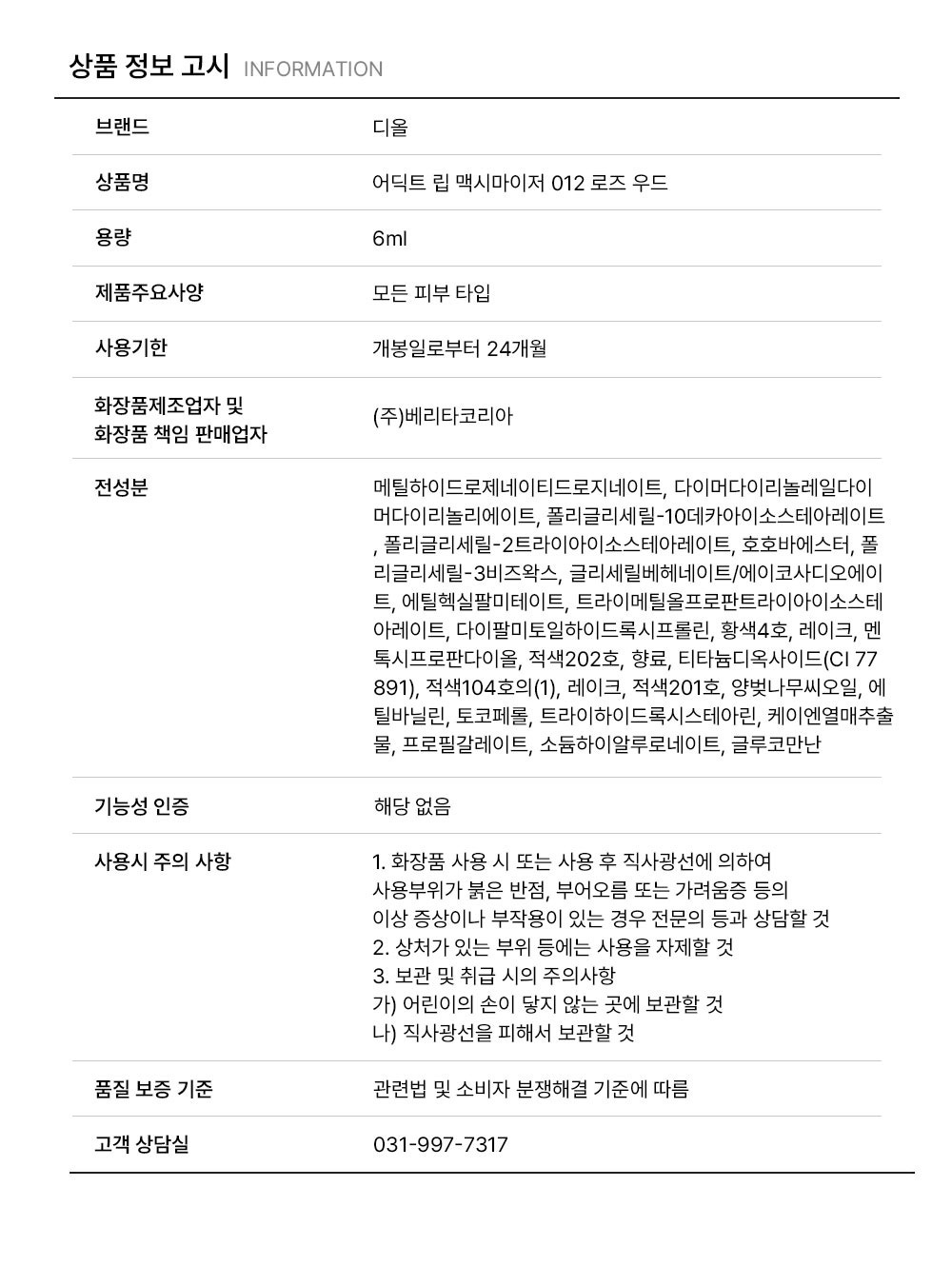 | 상품명 / 모델명 | 디올 어딕트 립 맥시마이저 012 로즈 우드 / 디올 어딕트 립 맥시마이저 012 로 |