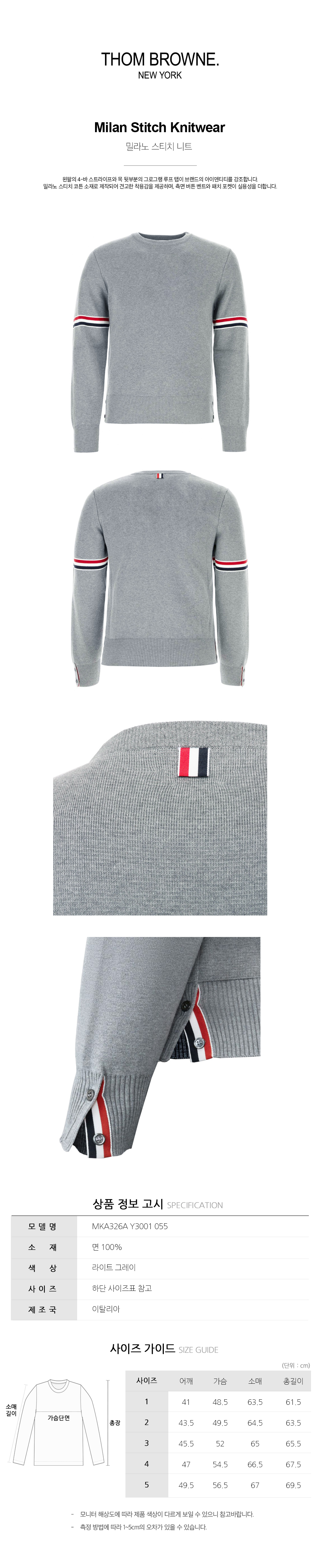 톰브라운 톰브라운 밀라노 스티치 코튼 크루 니트 라이트 그레이 MKA326A Y3001 055